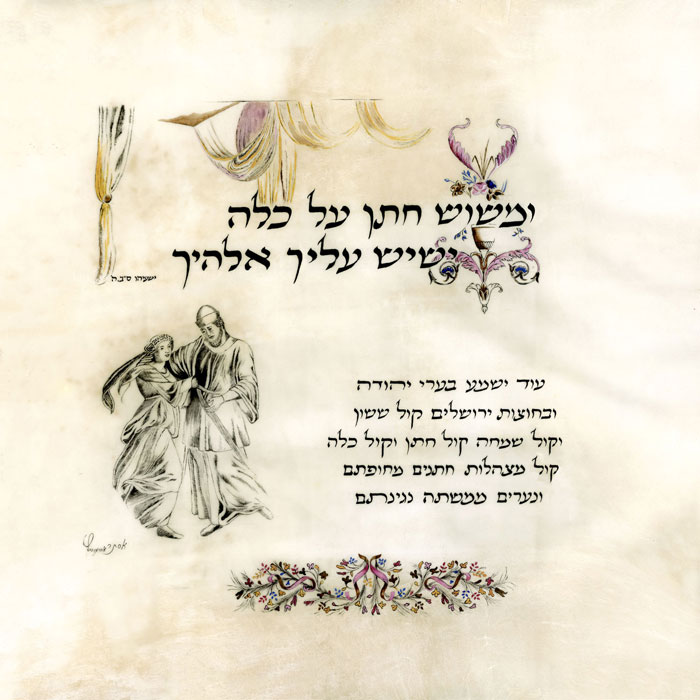 באיור נראים החתן והכלה מתחת לחופתם, כשלצידם קטע מברכת "שבע ברכות", ברכה הנאמרת מתחת לחופה.