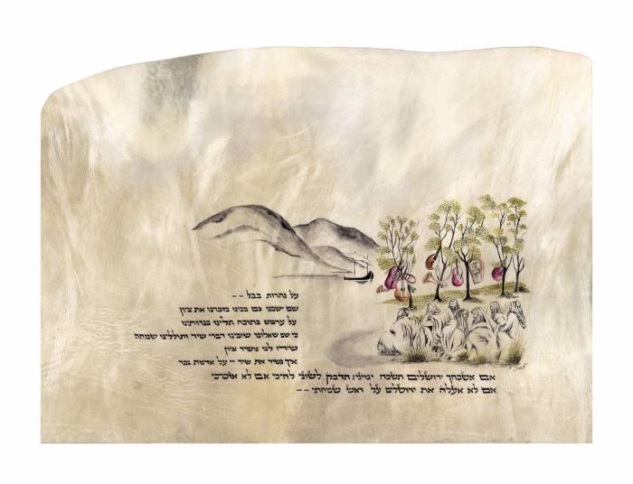 התמונה, שבה אנו רואים את היהודים שגלו מארצם, יושבים על שפת הנהר וכלי נגינתם תלויים על עצי הערבה, ממחישה את החורבן בכל עוצמתו...