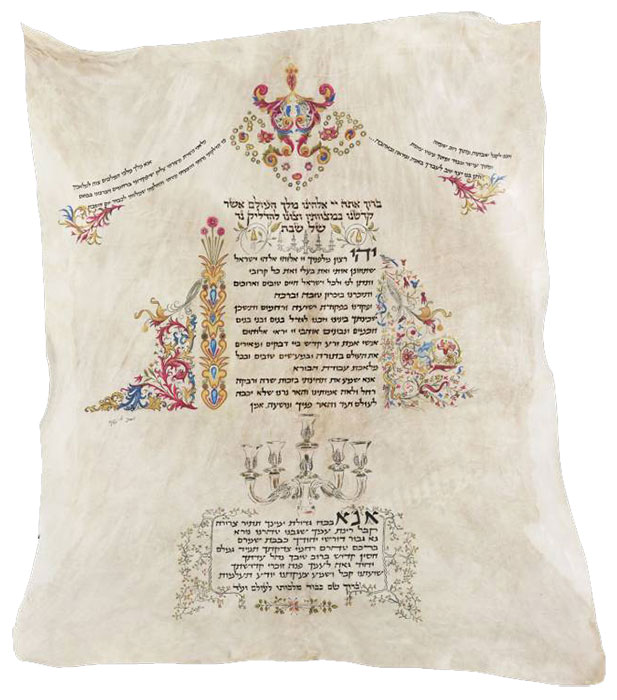 בצידי התמונה שילבנו קטעים מהתפילה הנאמרת בליל שבת אחרי שירת "שלום עליכם" – "אנא מלך מלכי המלכים ... צוה למלאכיך שיפקדוני ברחמים כי הדלקתי נרותי והצעתי מטתי והחלפתי שמלותי לכבוד יום השבת"...