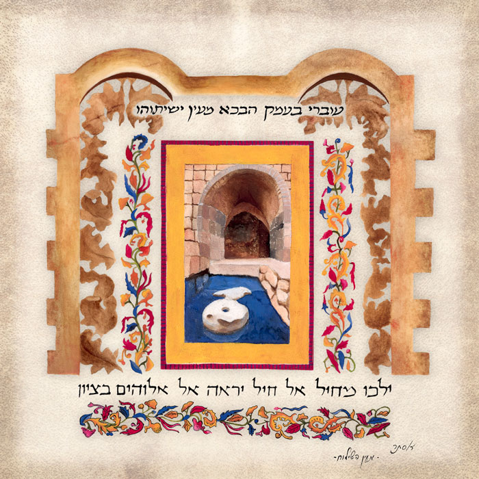 הישועה נמשלה למעין נובע – "ושאבתם מים בששון ממעייני הישועה".. ולכן הפסוקים שנבחרו לתמונה זו מספר תהילים, מסמלים הן את מצב "עוברי בעמק הבכא" – הבכי והתחינה לישועה, והן את ההבטחה שלאחריה – "ילכו מחיל אל חיל..."