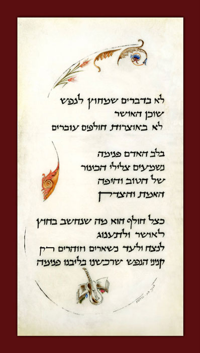 במהלך החיים, לומדים אנו יותר ויותר עד כמה האושר והשלוה הפנימית אינם תלויים כלל בעושרו של האדם, אלא, יותר מכל – בשלימות הפנימית ובסיפוק שהוא חש כאשר הוא ממלא את ייעודו בחיים.