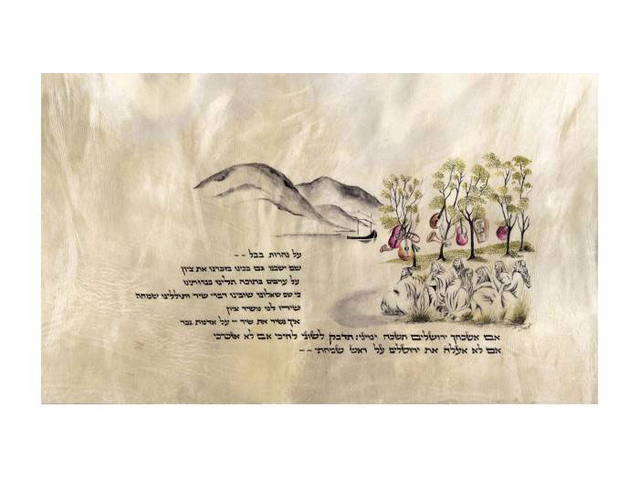 התמונה, שבה אנו רואים את היהודים שגלו מארצם, יושבים על שפת הנהר וכלי נגינתם תלויים על עצי הערבה, ממחישה את החורבן בכל עוצמתו...