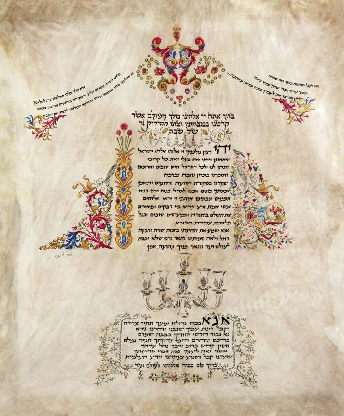 בצידי התמונה שילבנו קטעים מהתפילה הנאמרת בליל שבת אחרי שירת "שלום עליכם" – "אנא מלך מלכי המלכים ... צוה למלאכיך שיפקדוני ברחמים כי הדלקתי נרותי והצעתי מטתי והחלפתי שמלותי לכבוד יום השבת"...