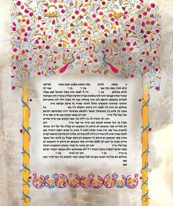 הטקסט משולב בין שני עצים המתאחדים בפריחה יפהפיה, ומשתלבים זה בזה, וביניהם זוג טווסים..., מסמל את השתלבות החתן והכלה בבנית ביתם החדש... וכמובן את הפריחה שתלווה אותם...
